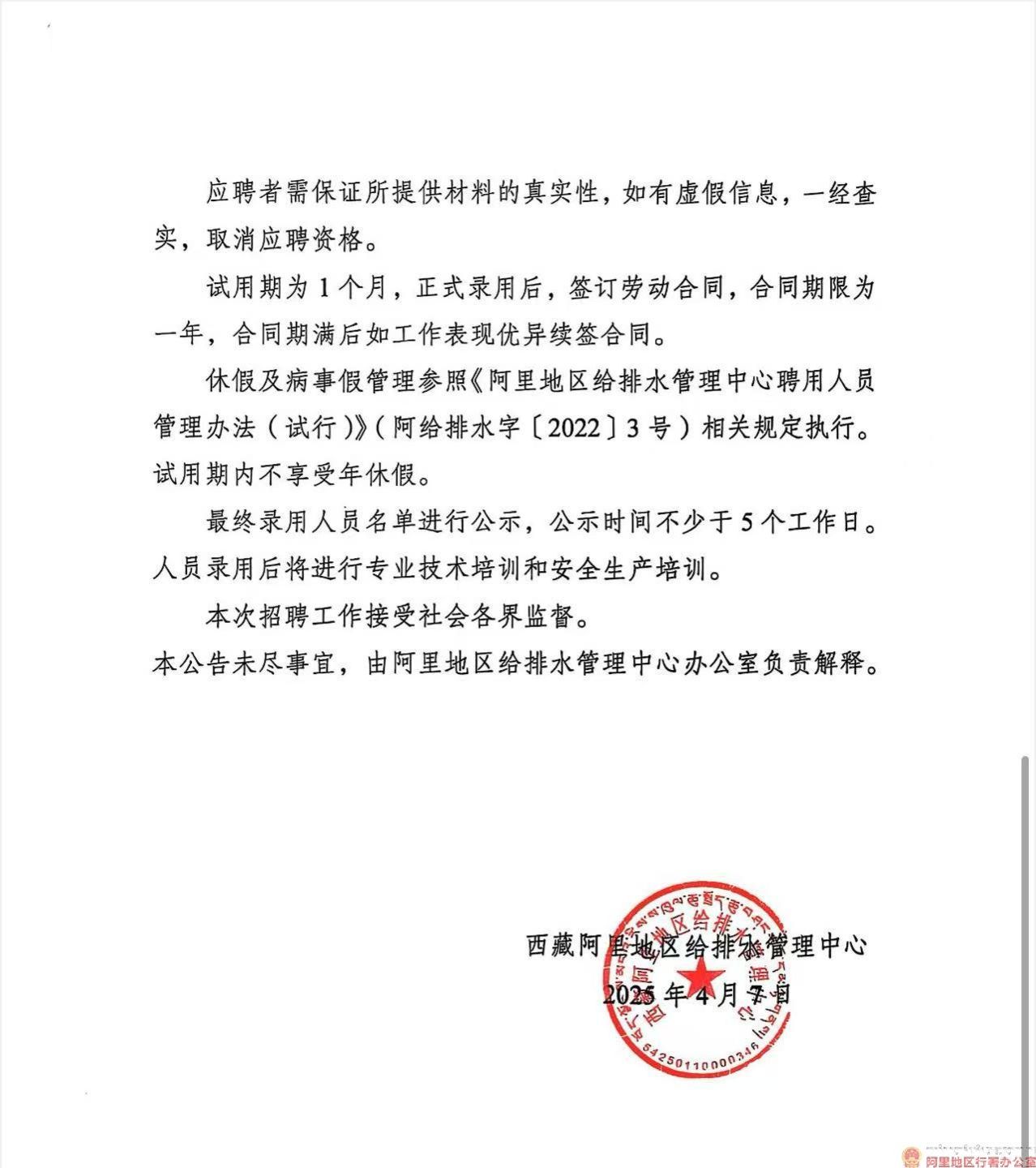 西藏阿里地区给排水管理中心污水处理厂司机及化验员招聘公告